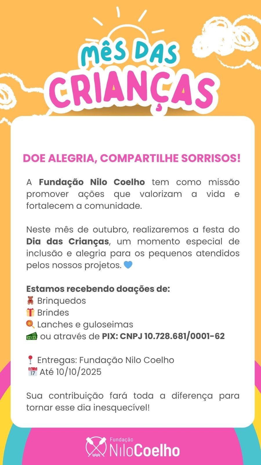 Com o objetivo de fortalecer os laços de solidariedade, a Fundação Nilo Coelho está realizando uma campanha especial para celebrar o mês das crianças. A iniciativa busca arrecadar brinquedos, brindes, lanches, guloseimas ou contribuições financeiras via PIX.
